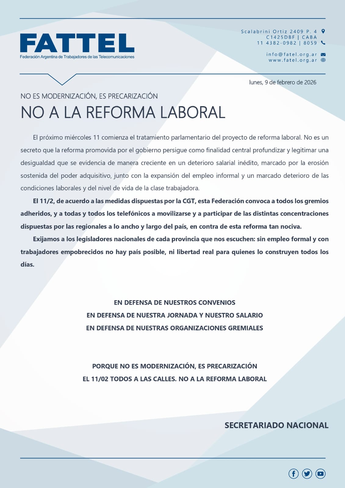 Comunicado de FATTEL: NO A LA REFORMA LABORAL